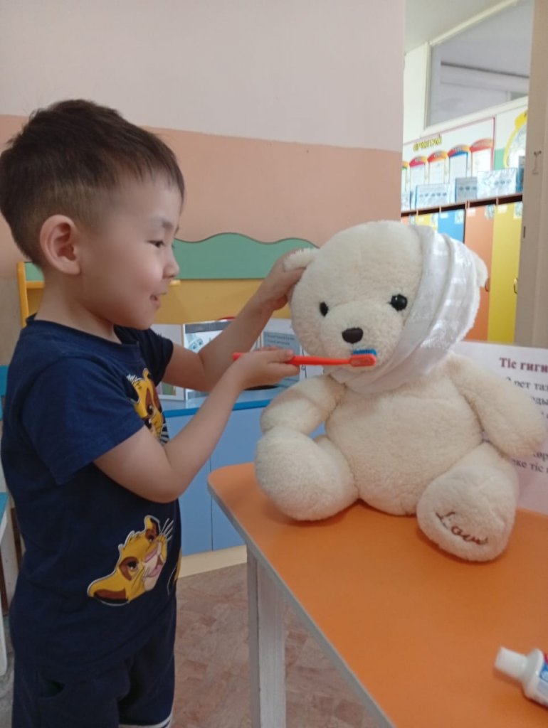 Ортаңғы "Еркетай" тобына Ақ мамық мысық өзінің Умка атты аю досын алып келіп, бүлдіршіндерден көмек сұрады. Умканың тісі ауырып, не істерін білмеді. Тәрбиеші мен балалар Умкаға тістің тазалығын сақтаудың маңыздылығын айтты. Тісті күніне екі рет жуу керек екенін түсіндіріп, тәтті көп жеуге болмайтынын түсіндірді. Балалар Умканың тісін тазалап берді. Умка аю кішкентай бүлдіршіндерге риза болды.