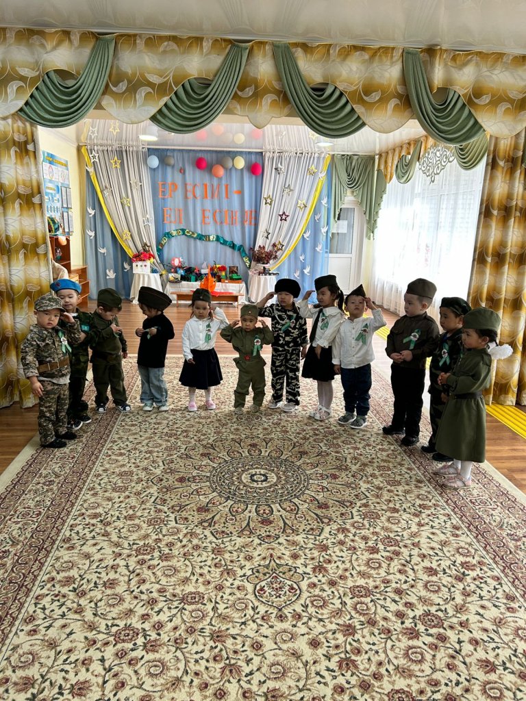 "Балбөбек" санаторлық тобының балаларымен 9 мамыр Жеңіс күнінің 80 жылдығына арналған "Ер есімі - ел есінде" атты ертеңгілік өткізілді. Мақсаты: Балаларды өз Отанын,, елін, жерін сүюге, қорғауға , ардагерлерге, батырларға құрмет көрсетуге, еңбек етуге тәрбиелеу. Балалар Отан туралы әндерді музыка әуеніне қосылып айтты. "Кім епті?”, "Кім жылдам?” ойындарын ойнады. Әскери флешмоб биледі.