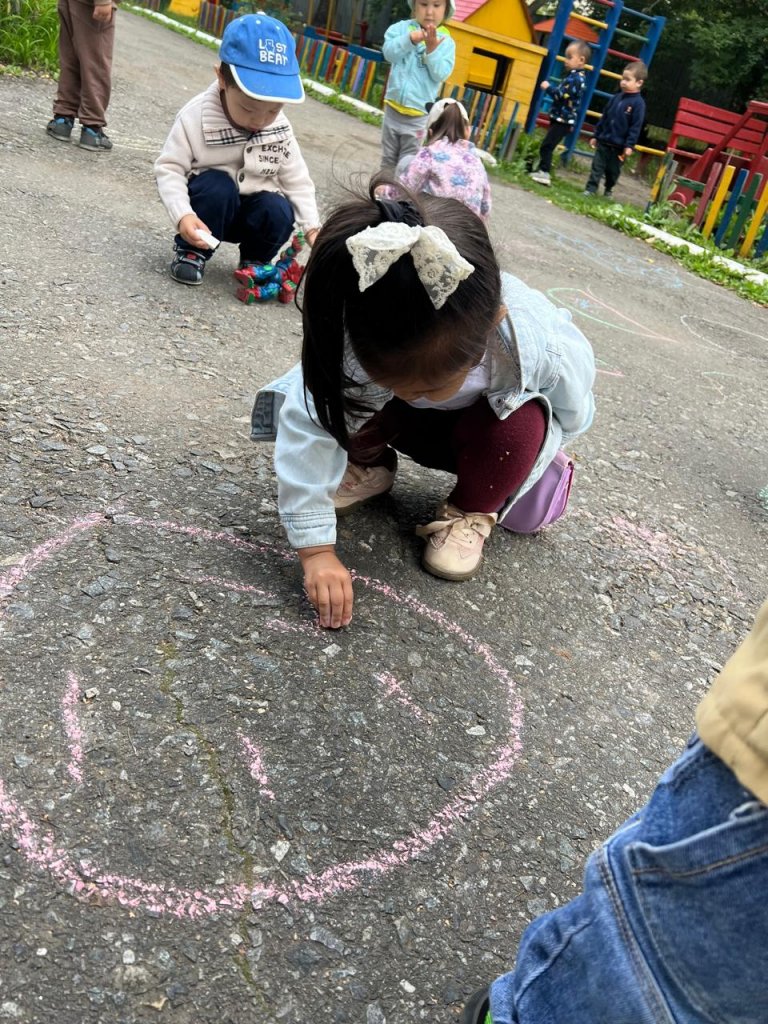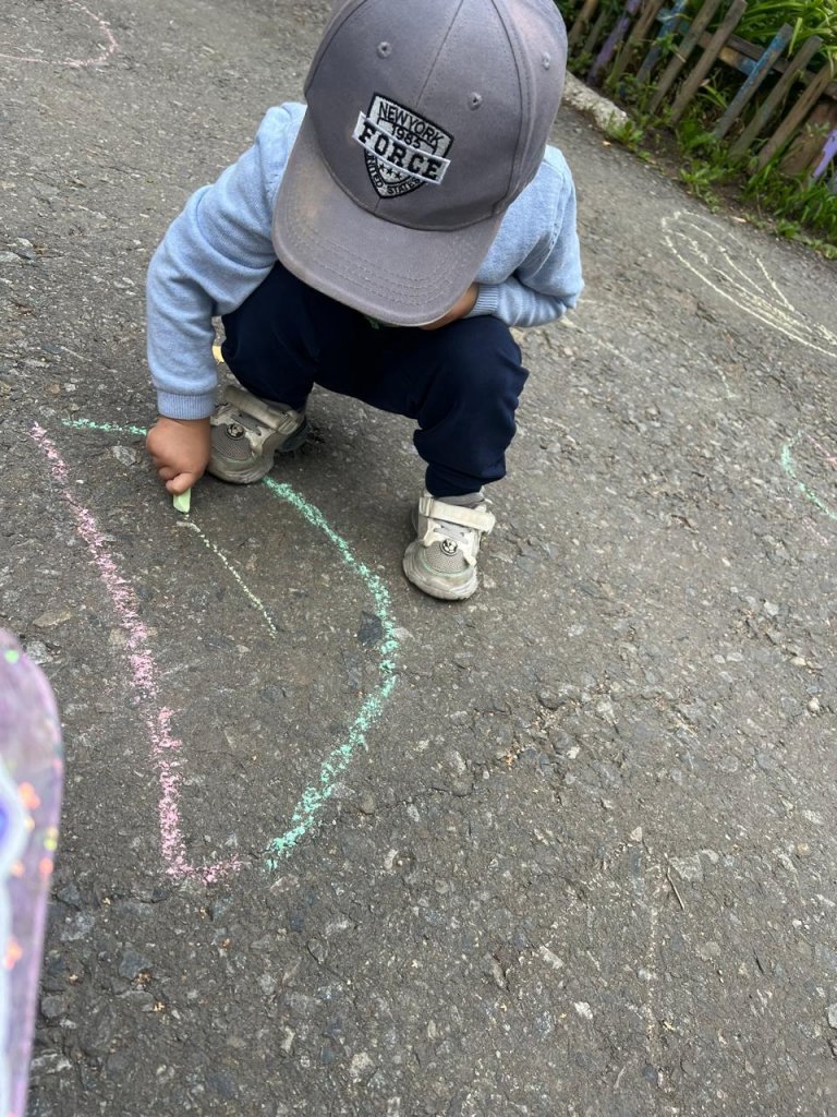 Бүгін балдырғандар таза ауада ерекше шығармашылықпен айналысты. Олар асфальт бетіне түрлі-түсті бормен жеміс-жидектердің суретін салып, бояды. 🍎🍓🍇
