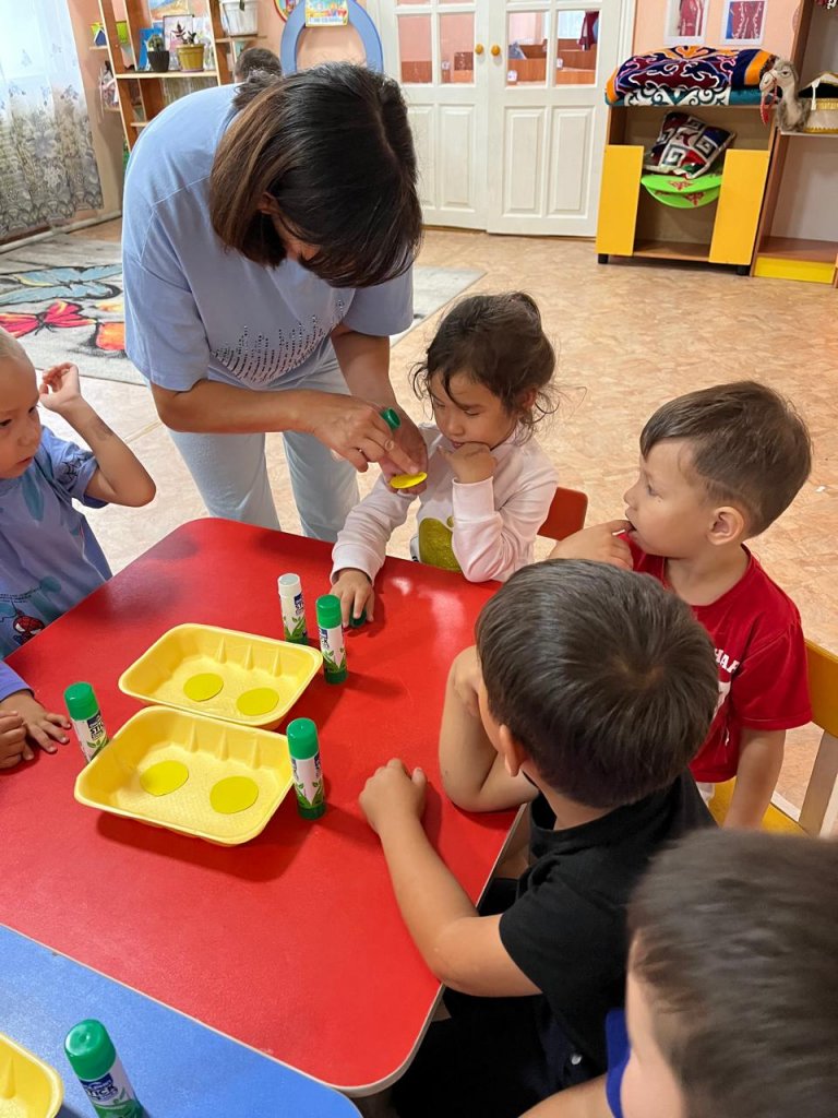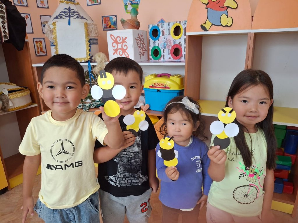 🎨 Шығармашылық жұмыс барысында бүлдіршіндер араның пішінін желім арқылы жапсырып, ерекше қызығушылық танытты.