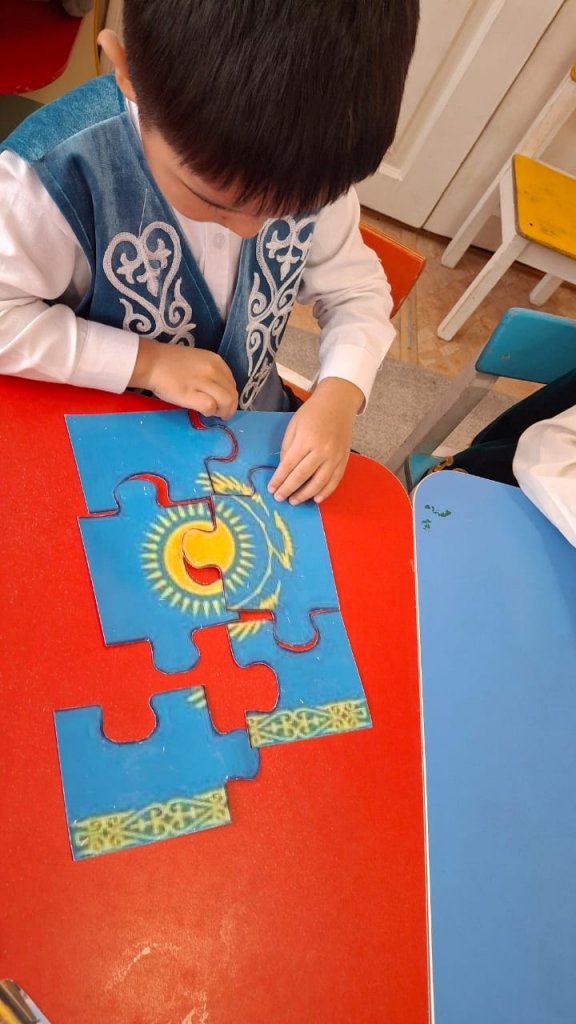 Тәрбиеленушілер Мемлекеттік рәміздерге арналған пазл құрастырып, Ту, Елтаңба, Гимн туралы білімдерін бекітті.