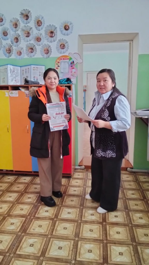 «Балдырған» тобының тәрбиешісі Айдана Булатовна ата-аналарға «Туберкулезден сақтан» тақырыбында ақпараттандыру жұмысын жүргізді. Жаднама таратып, алдын алу шаралары мен сақтық ережелері туралы кеңес берді.