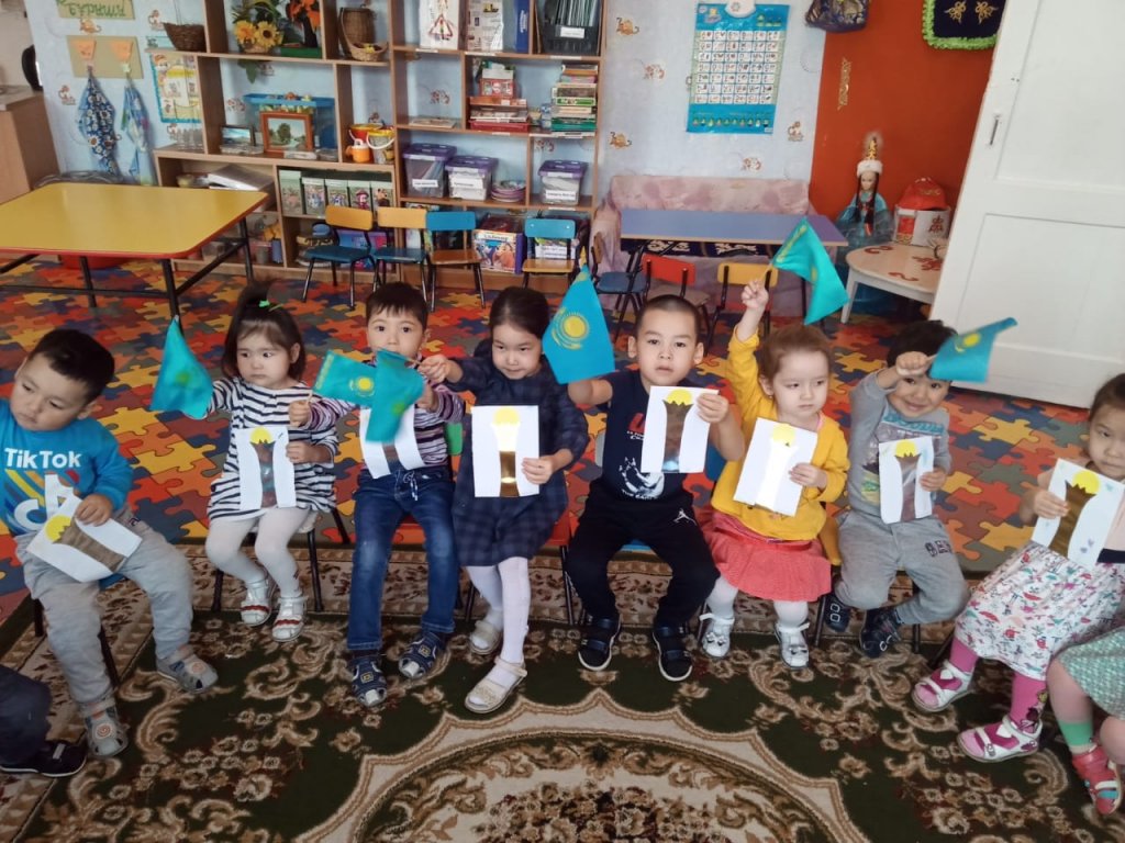 Балалар әнұранды орындап, Қазақстан Республикасының рәміздері жайлы айтылды, өз білгендерін ортаға салып, ойларымен бөлісті.Оқу қызметінің соңында «Бәйтеректі» қағаз бетіне жапсырды.